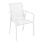Enhance your space with the Siesta Pacific white resin outdoor arm chair with white sling! Crafted with commercial-grade polypropylene resin, this chair is built for reliable, long-lasting use. This chair features an arm on either side to provide sturdy support, ensuring durability and stability for your guests. Resistant to UV rays, suntan oils, chlorine, and salt, this chair is perfect for poolside lounging or outdoor dining areas. The white mesh fabric sling adds comfort and style, making it an inviting seating option for customers.