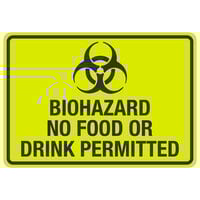 Clearly alert employees, visitors, and patrons with this Lavex "Biohazard / No Food Or Drink Permitted" engineer-grade reflective black / yellow decal with symbol. Built for enhanced visibility, this item is bound to encourage ideal safety standards in healthcare facilities, research centers, or other high-volume settings. While its vibrant yellow backdrop helps to draw attention, its bold black text allows for easy readability. Plus, by warning staff and customers about areas where biohazards are present, this item is sure to reduce the spread of germs and bacteria. The decal even features a distinctive graphic for better comprehension. Place it near your laboratory doors or other hazardous area entryways to promote responsible awareness and keep everyone in the best of health.