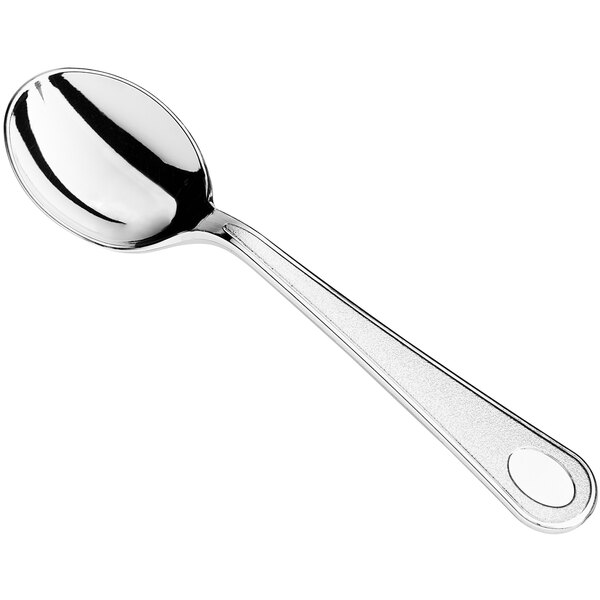 Elevate your serving and display presentation with this Visions 5 7/8" Satin heavy weight silver plastic soup spoon!