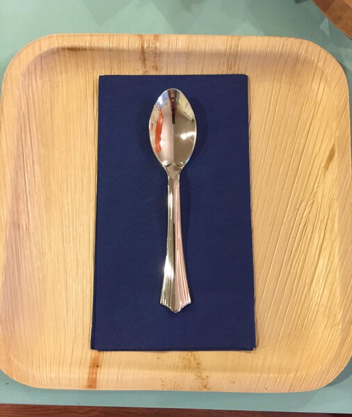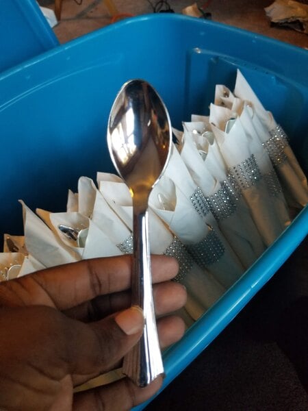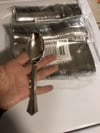 The spoons in the picture look amazing when I looked at the packages in Box they look good but as soon as I pulled them out of the box I noticed black stings on the spoons a lot of the spoons had scratches and there's even some that were broken inside the packets I am very disappointed not sure what I'm going to do now weddings right around the corner.