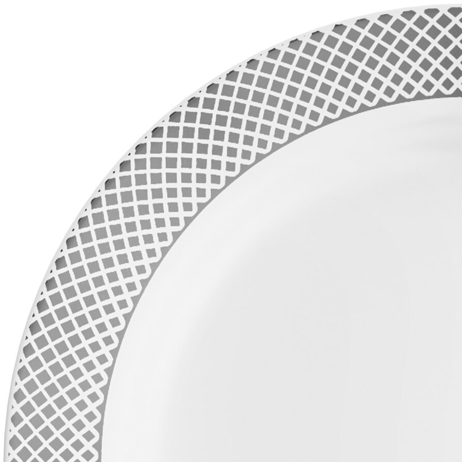 A contemporary silver lattice pattern along the wide outer rim serves as a striking contrast to the stark white body of this plate. It's sure to draw attention while adding an upscale look to your wedding receptions, banquets, or other catered events.