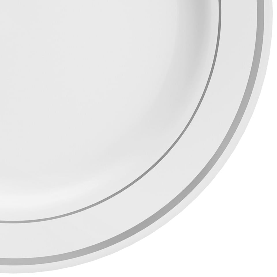 Featuring a contemporary silver band pattern along the wide outer rim, this plate's striking contrast between rim and stark white body is sure to draw attention while adding an upscale look to your wedding receptions, banquets, or other catered events.