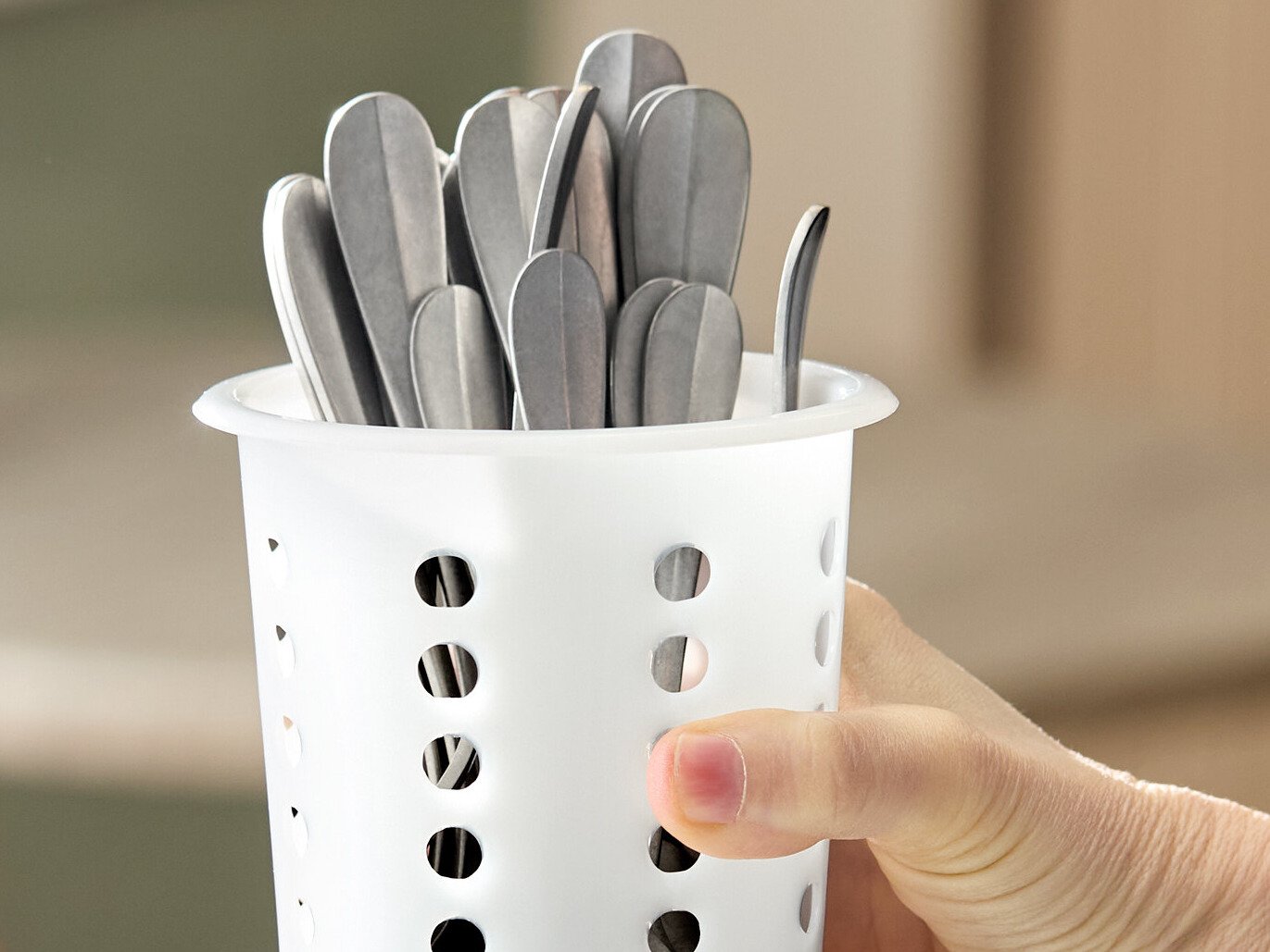 White Perforated Plastic Flatware Cylinder has multiple uses. I use it to hold silverware while washing and is a cheaper alternative to strain veggies amd water from pasta