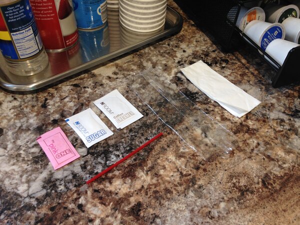 Great value on these hot beverage condiment kits. Everything you need for a single coffee or tea. Stir stick, napkin, creamer, sugar, and sugar substitute. Perfect.