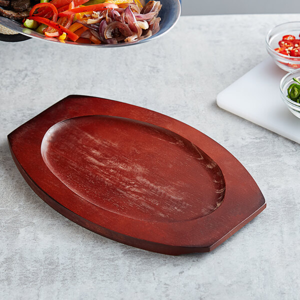 Easily serve piping hot steaks and fajitas with this Choice 13 1/2" x 8 3/4" oval rubberwood underliner with mahogany finish!