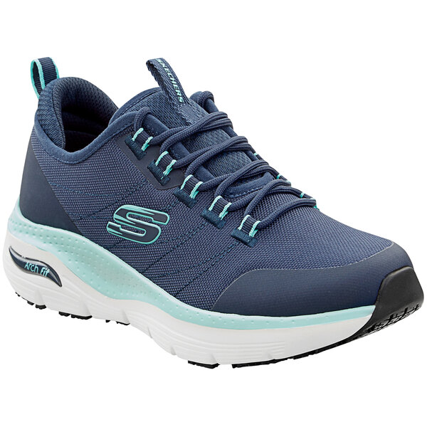 Step up to the next level of professional footwear with the Skechers Christina women's 8 Arch Fit medium width navy / aqua soft toe non-slip athletic shoe SSK8096NVAQ. Featuring a water- and stain-resistant nylon upper with TPU toe and heel overlays, the Christina women's style offers the extensive protection you need while maintaining the luxurious comfort you desire when you're on your feet all day. The padded knit tongue and heel wrap collar reduce the stress of standing or walking for long periods of time.