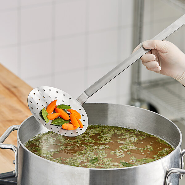 The handle of this skimmer is long, much longer than a regular home kitchen utensil. It seems welded really well. Take note that it is not a one piece construction but the welding is good and overall sturdy. I have not seen any gaps. Also the skimmer handle is mostly straight so it allows you to use it in deeper pots