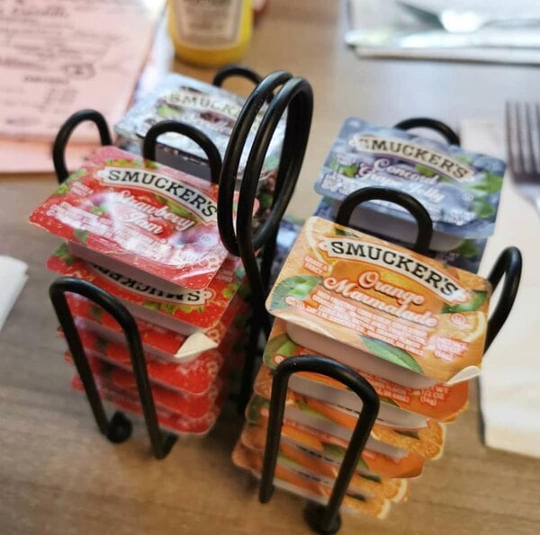 These jams, jellies and marmalades from Smuckers are a good value. Very convenient to have them in portion cups. They are delicious to spread on toasts and other goodies.