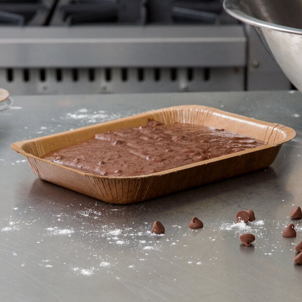 Save time and cut down on costs with the Solut 8 1/2" x 6" Bake and Show heavy weight paperboard entree/brownie pan! This disposable heavy weight pan provides a unique and cost effective alternative to plastic and metal pans. Constructed from durable, sustainable heavy weight paper board that's domestically-produced heavy weight paperboard, the pan is strong enough to handle a variety of freezer to oven applications and the transportation of baked goods. Great for bake and display applications, this pan is certified as fully recyclable! Dual-ovenable up to 400 degrees Fahrenheit for up to 1 hour, this pan is microwave and oven safe, making for a versatile and convenient kitchen accessory!