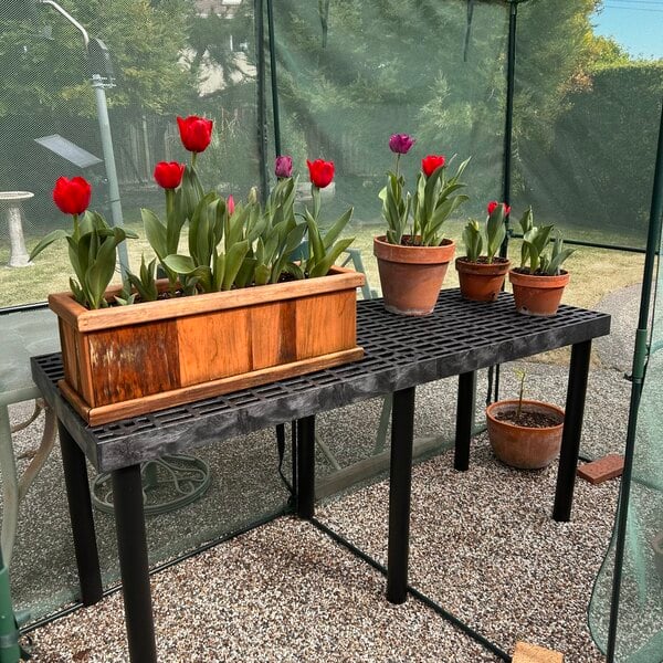 Extremely sturdy, breathable, perfect height so I don't have to bend over anymore. I will be purchasing another one. We are using this as a table in our green house. We love that it breathes so there is no standing water and the center support ensures that it will hold up to 350 lbs. Easy to clean. I would love to add some caster wheels to the bottom so it can be easily maneuvered.
