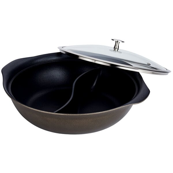 This casserole pan is made of durable, scratch-resistant cast aluminum with a stainless steel core. This construction makes the pan heat up quickly and evenly, allowing you to cook your dishes perfectly every time. It comes with a tempered, steam-release glass cover so you can protect your dishes from harmful contaminants as you display them. The cover is reinforced with a brushed stainless steel rim for added longevity and damage-resistance. The pan's curled handles prevent deterioration and stop bacteria from accumulating, making this pan both a sustainable and sanitary option. Attractive, convenient, and extremely durable, this Spring USA Motif divided non-stick casserole pan will make a great addition to any food service establishment!