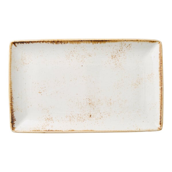Elevate your tabletop presentation with this Steelite Performance Craft 10 5/8" x 6 1/2" white rectangular tray. Featuring a rustic design inspired by generations of handcrafted pottery, this tray combines traditional charm with contemporary appeal. Its bold brown rim and unique speckled pattern give each piece a one-of-a-kind look, making it a distinctive choice for any table setting.