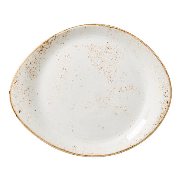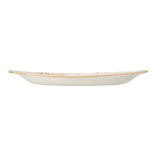 Elevate your tabletop presentation with this Steelite Performance Craft 10" x 8 1/8" white FreeStyle plate. Featuring a rustic design inspired by generations of handcrafted pottery, this oblong plate combines traditional charm with contemporary appeal. Its bold brown rim and unique speckled pattern give each piece a one-of-a-kind look, making it a distinctive choice for any table setting.