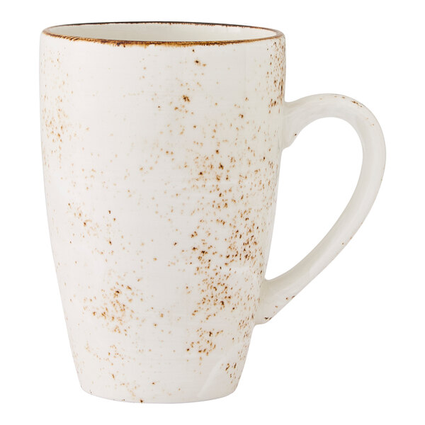 Elevate your beverage service with this Steelite Performance Craft 12 oz. white quench mug. Featuring a rustic design inspired by generations of handcrafted pottery, this mug combines traditional charm with contemporary appeal. Its bold brown rim and unique speckled pattern give each piece a one-of-a-kind look, making it a distinctive choice for any table setting.
