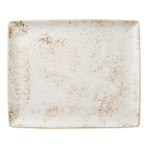 Elevate your tabletop presentation with this Steelite Performance Craft 13 1/2" x 10 5/8" white rectangular tray. Featuring a rustic design inspired by generations of handcrafted pottery, this tray combines traditional charm with contemporary appeal. Its bold brown rim and unique speckled pattern give each piece a one-of-a-kind look, making it a distinctive choice for any table setting.