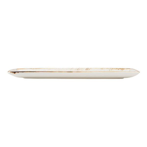 Elevate your tabletop presentation with this Steelite Performance Craft 13" x 7 1/2" white rectangular tray. Featuring a rustic design inspired by generations of handcrafted pottery, this tray combines traditional charm with contemporary appeal. Its bold brown rim and unique speckled pattern give each piece a one-of-a-kind look, making it a distinctive choice for any table setting.