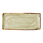 Elevate your tabletop presentation with this Steelite Performance Craft 14 1/2" x 6 1/2" green rectangular tray. Featuring a rustic design inspired by generations of handcrafted pottery, this tray combines traditional charm with contemporary appeal. Its earthy green hue with a bold brown rim and unique speckled pattern give each piece a one-of-a-kind look, making it a distinctive choice for any table setting.