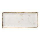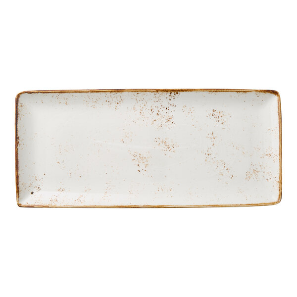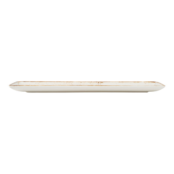 Elevate your tabletop presentation with this Steelite Performance Craft 14 1/2" x 6 1/2" white rectangular tray. Featuring a rustic design inspired by generations of handcrafted pottery, this tray combines traditional charm with contemporary appeal. Its bold brown rim and unique speckled pattern give each piece a one-of-a-kind look, making it a distinctive choice for any table setting.