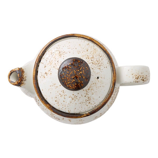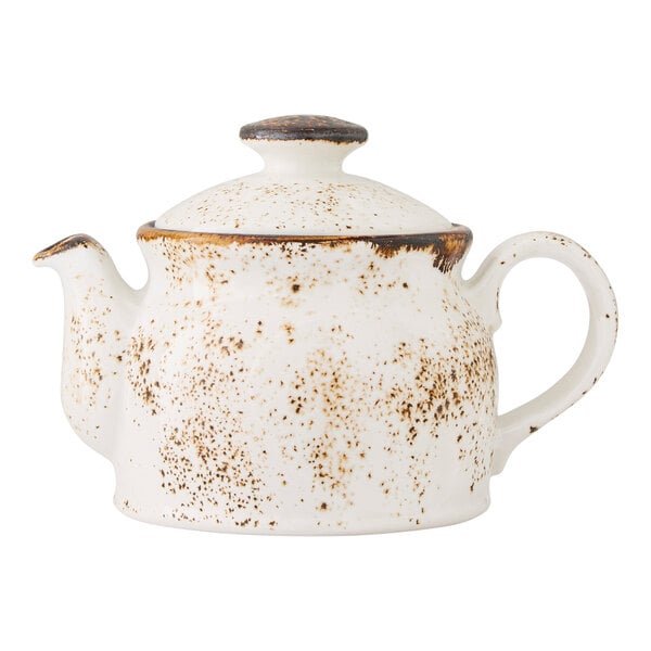 Elevate your beverage service with this Steelite Performance Craft 15 oz. white club teapot with lid. Featuring a rustic design inspired by generations of handcrafted pottery, this teapot combines traditional charm with contemporary appeal. Its bold brown rim, unique speckled pattern, and convenient handle offer both functionality and a distinctive, artisanal look, making it a perfect addition to any tea or coffee service.