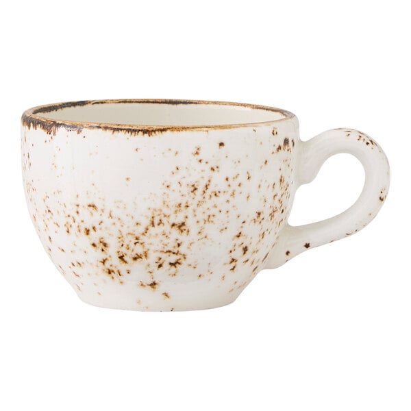 Elevate your beverage service with this Steelite Performance Craft 3 oz. white low cup. Featuring a rustic design inspired by generations of handcrafted pottery, this cup combines traditional charm with contemporary appeal. Its bold brown rim and unique speckled pattern give each piece a one-of-a-kind look, making it a distinctive choice for any table setting.