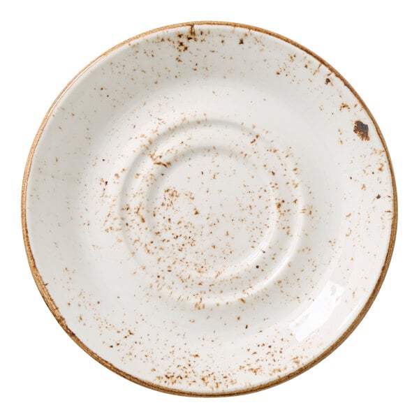 Elevate your tabletop presentation with this Steelite Performance Craft 5 3/4" white double well saucer. Featuring a rustic design inspired by generations of handcrafted pottery, this saucer combines traditional charm with contemporary appeal. Its bold brown rim and unique speckled pattern give each piece a one-of-a-kind look, making it a distinctive choice for any table setting.