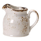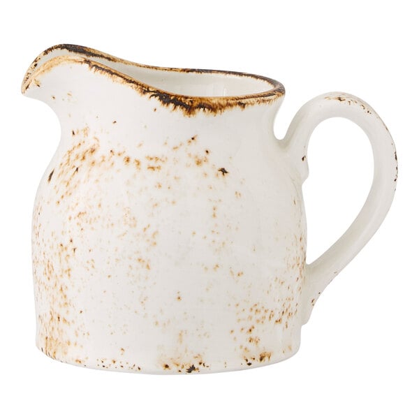 Elevate your tabletop presentation with this Steelite Performance Craft 5 oz. white club jug. Featuring a rustic design inspired by generations of handcrafted pottery, this jug combines traditional charm with contemporary appeal. Its bold brown rim, unique speckled pattern, and sturdy handle give each piece a one-of-a-kind look, making it a distinctive choice for any table setting.