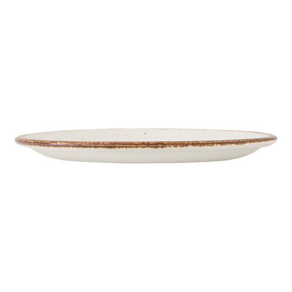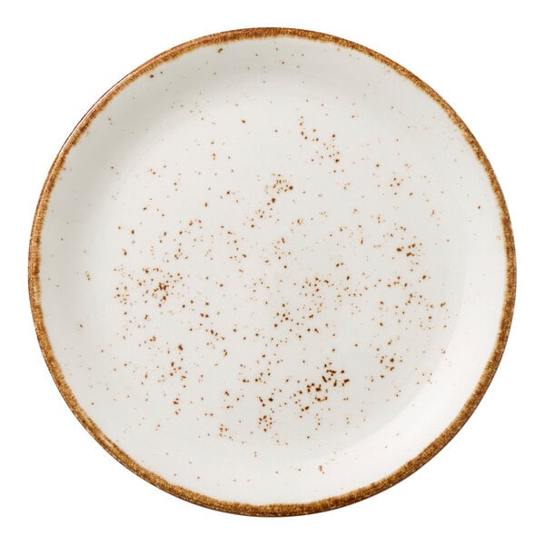 Elevate your tabletop presentation with this Steelite Performance Craft 6" white coupe plate. Featuring a rustic design inspired by generations of handcrafted pottery, this plate combines traditional charm with contemporary appeal. Its bold brown rim and unique speckled pattern give each piece a one-of-a-kind look, making it a distinctive choice for any table setting.