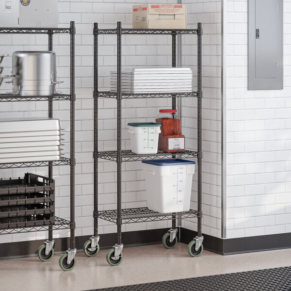 Keep your storage area organized with the commercial-grade Steelton 14" x 24" NSF black epoxy 4-shelf kit with 54" posts and casters!