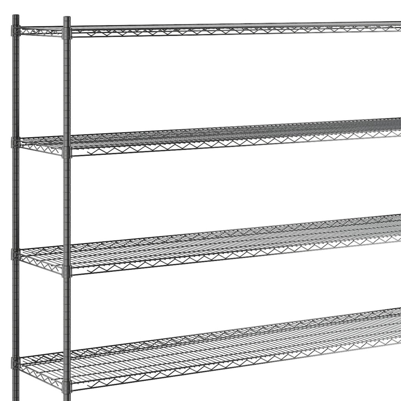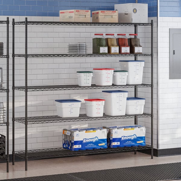 This black epoxy shelf kit includes (5) 18" x 24" wire shelves and (4) 72" posts, which allow you to create a convenient storage solution for your janitorial closet, warehouse, or walk-in cooler. Incredibly easy to install, this kit can be quickly assembled once it arrives so that you can begin using it immediately!