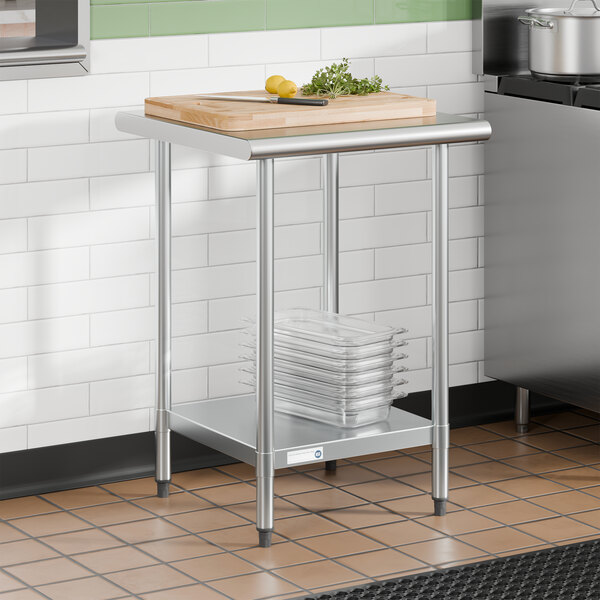 Enhance your kitchen's efficiency with the Steelton 24" x 24" 16 gauge 430 stainless steel work table with undershelf! Constructed from durable 16 gauge, type 430 stainless steel, this work table is built to withstand the demands of lower volume kitchens and startups. Ideal for areas of your business that don't require a heavy-duty table, this cost-effective work table is great for prepping vegetables, opening cans, mixing ingredients, and storing light items, such as cutting boards, towels, or sanitizing pails. The galvanized steel legs and undershelf provide additional stability and support.