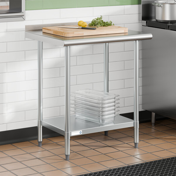 Enhance your kitchen's efficiency with the Steelton 24" x 30" 16 gauge 430 stainless steel work table with undershelf and 2" backsplash! Constructed from durable 16 gauge, type 430 stainless steel, this work table is built to withstand the demands of lower volume kitchens and startups. Ideal for areas of your business that don't require a heavy-duty table, this cost-effective work table is great for prepping vegetables, opening cans, mixing ingredients, and storing light items, such as cutting boards, towels, or sanitizing pails. The galvanized steel legs and undershelf provide additional stability and support.