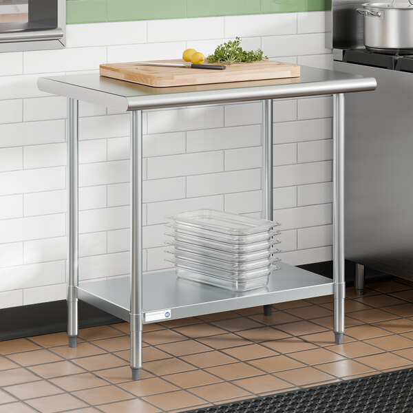Enhance your kitchen's efficiency with the Steelton 24" x 36" 16 gauge 430 stainless steel work table with undershelf! Constructed from durable 16 gauge, type 430 stainless steel, this work table is built to withstand the demands of lower volume kitchens and startups. Ideal for areas of your business that don't require a heavy-duty table, this cost-effective work table is great for prepping vegetables, opening cans, mixing ingredients, and storing light items, such as cutting boards, towels, or sanitizing pails. The galvanized steel legs and undershelf provide additional stability and support.