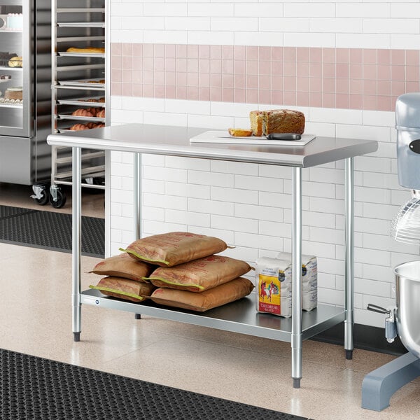 Enhance your kitchen's efficiency with the Steelton 24" x 48" 16 gauge 430 stainless steel work table with undershelf! Constructed from durable 16 gauge, type 430 stainless steel, this work table is built to withstand the demands of lower volume kitchens and startups. Ideal for areas of your business that don't require a heavy-duty table, this cost-effective work table is great for prepping vegetables, opening cans, mixing ingredients, and storing light items, such as cutting boards, towels, or sanitizing pails. The galvanized steel legs and undershelf provide additional stability and support.