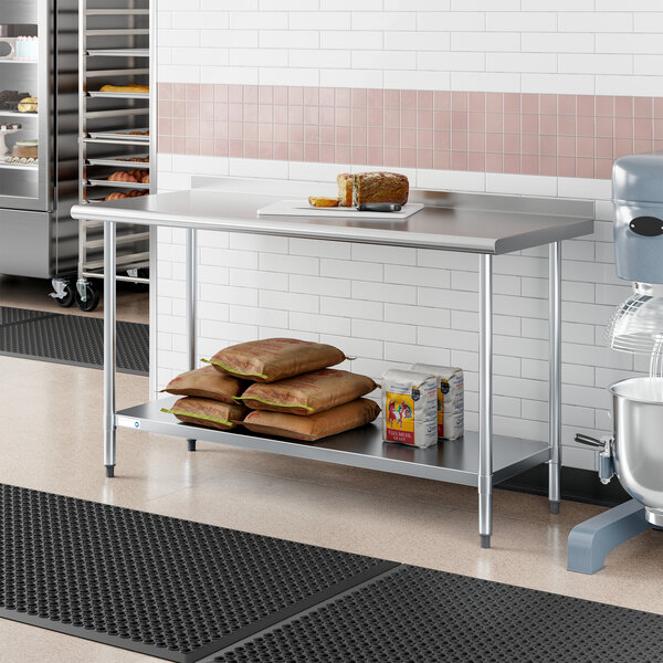 Enhance your kitchen's efficiency with the Steelton 24" x 60" 16 gauge 430 stainless steel work table with undershelf and 2" backsplash! Constructed from durable 16 gauge, type 430 stainless steel, this work table is built to withstand the demands of lower volume kitchens and startups. Ideal for areas of your business that don't require a heavy-duty table, this cost-effective work table is great for prepping vegetables, opening cans, mixing ingredients, and storing light items, such as cutting boards, towels, or sanitizing pails. The galvanized steel legs and undershelf provide additional stability and support.