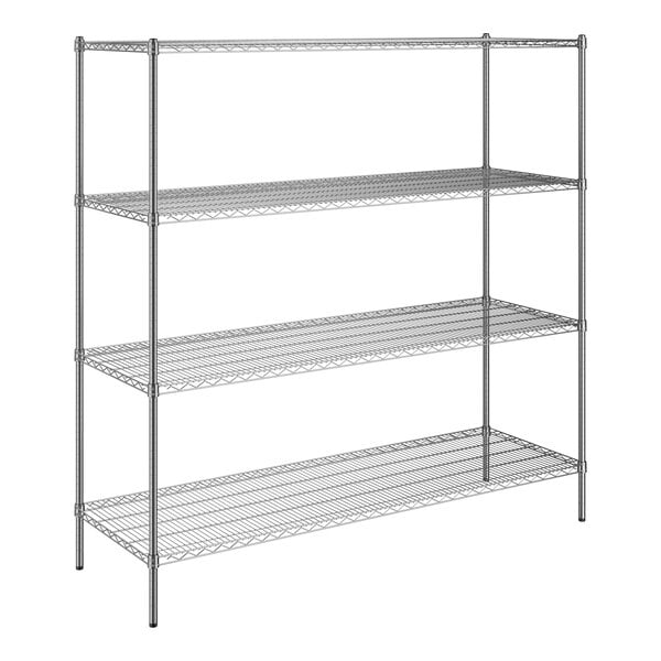 This chrome shelf kit includes (4) 24" x 72" wire shelves and (4) 72" posts, which allow you to create a convenient storage solution for your janitorial closet, warehouse, or walk-in cooler. Incredibly easy to install, this kit can be quickly assembled once it arrives so that you can begin using it immediately!