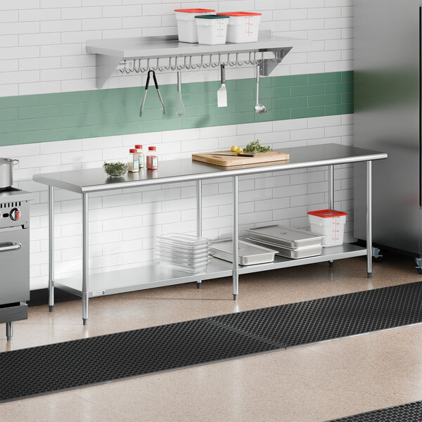Enhance your kitchen's efficiency with the Steelton 24" x 96" 16 gauge 430 stainless steel work table with undershelf! Constructed from durable 16 gauge, type 430 stainless steel, this work table is built to withstand the demands of lower volume kitchens and startups. Ideal for areas of your business that don't require a heavy-duty table, this cost-effective work table is great for prepping vegetables, opening cans, mixing ingredients, and storing light items, such as cutting boards, towels, or sanitizing pails. The galvanized steel legs and undershelf provide additional stability and support.