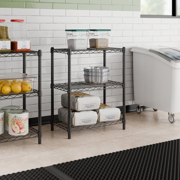 Keep your storage area organized with this commercial-grade Steelton shelf kit! This shelf kit includes (3) 14" x 24" wire shelves, (4) 30" posts, and (12) pairs of split sleeves to create a convenient storage solution for your janitorial closet, warehouse, or walk-in cooler. Incredibly easy to install, this kit can be quickly assembled for immediate use! Its black epoxy coating is suitable for both dry and moist environments, making it a commercial-grade, multipurpose investment that's sure to accommodate your ever-evolving needs. The adjustable shelves accommodate items of varying heights, such as ingredient bins, boxes, and cleaning supplies.