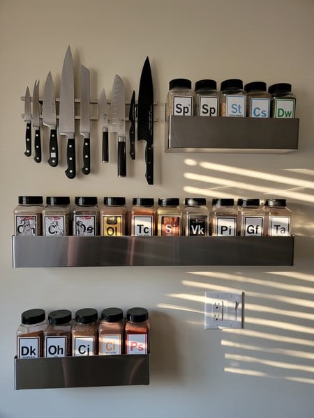 Steelton Speedrails are some of the best kitchen (and garage) secrets. Sure, they are great behind the bar and in the commercial kitchen. But they are also indispensable in this chef’s home! In the kitchen, these speed rails, hold all our commercial size spices. we started out with them inside our pantry, and then realized we love the way they looked so much, that we purchased more and gave them a spot front and center. In our garage, they’re indispensable - check out how much they can hold! We’ve been using these at home for almost ten years now, and they look just as good as when we first put them up. Oh, they hold the mid-size spice bottles perfectly!