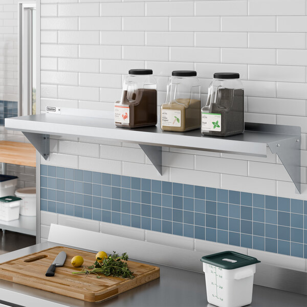 This shelf features a slim, space-saving profile. It includes 3 support brackets for easy wall mounting (hardware sold separately), allowing you to maximize your storage capacity without using valuable counter space. Keep ingredients, dishes, and kitchen tools from cluttering your work area with this reliable shelf.
