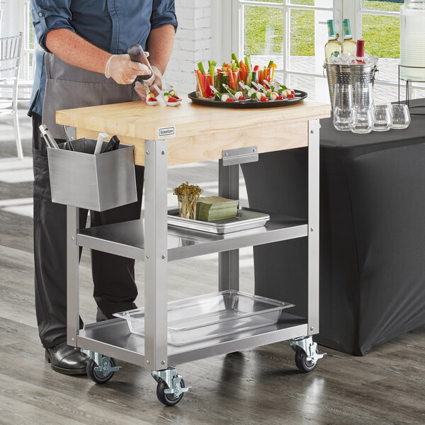 This work cart features a 20" x 30" solid rubberwood top that measures 1 3/4" thick and provides a more natural aesthetic than the standard steel top on most work carts. This makes it the perfect backdrop for a wide range of uses, such as preparing and serving samples at a supermarket or appetizers at a banquet hall.