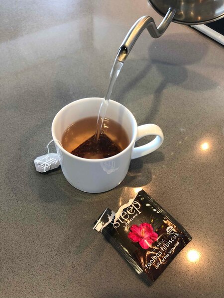 The Steep organic Rooibos hibiscus tea is very pleasant and soothing> I love the herbal nature from the hibiscus and the tea makes a great addition to our spa baskets. So good and perfect.