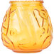 The details in your table settings can make a big difference, and this Sterno 40118 4 1/8" amber venetian candle gives guests a genuine, candlelight experience they'll remember. This wax-filled candle produces a warm, calming glow that will easily enhance the ambiance of your restaurant or bar. Thanks to the festive, embossed detailing on the glass, this candle fits perfectly with your Spanish or Mediterranean-inspired decor. Plus, the textured rim and bright amber color add to the candle's stylish look.