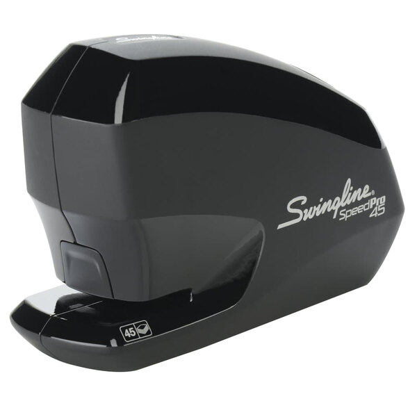 Easily attach documents together with this Swingline 42141A Speed Pro 45 sheet black full strip electric stapler! Boasting easy, effortless stapling, this electric stapler adds efficiency to all of your stapling projects. It can hold a full strip of (210) 1/4" staples so you can staple a lot of papers and memos without reloading. The convenient low-staple indicator also lets you know when it's time to reload.