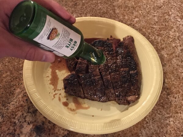 This tastes great on steak. I make carne asada all the time and this goes perfectly with that recipe. The heat is not overwhelming and it adds a lot of flavor.