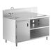 A 10" x 14" x 10" deep-drawn sink is conveniently located on the left side of the table for hand washing or dishwashing, while the cabinet underneath the sink has a swinging door that grants access to the sink components. The sink has a 1 1/2" drain basket to catch food debris.