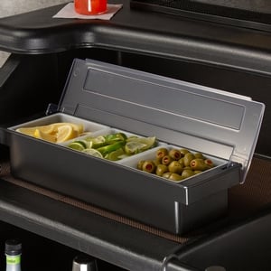 Offer your guests a variety of condiments at your breakfast buffet or organize drink garnishes at your bar or pub with this 3 compartment condiment holder! This tabletop condiment holder boasts a durable ABS plastic construction, attached lid, and 3 compartments to keep your offerings accessible and contaminant-free.
