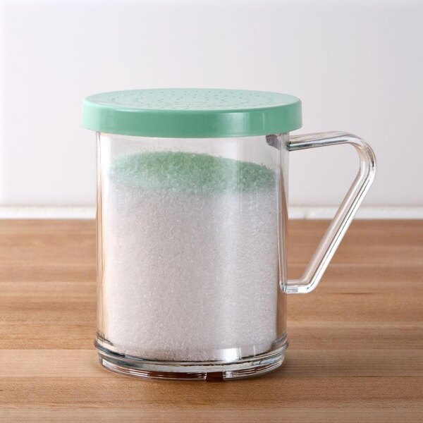 For finely ground pepper, spices, powered sugar, and more, use this Tablecraft 166B 10 oz. shaker and transform your kitchen into an organizational dream! Made of clear polycarbonate, this shaker is durable enough to withstand longterm use and is see-through, helping you to quickly identify spices. The accompanying snap-tight, plastic lid has small holes that are ideal for dispensing finely ground products, and the green color allows you to color-coordinate your seasonings and prevent confusion in the kitchen. With a 10 oz. capacity, this shaker holds just enough product to last through many uses without becoming too difficult to shake.