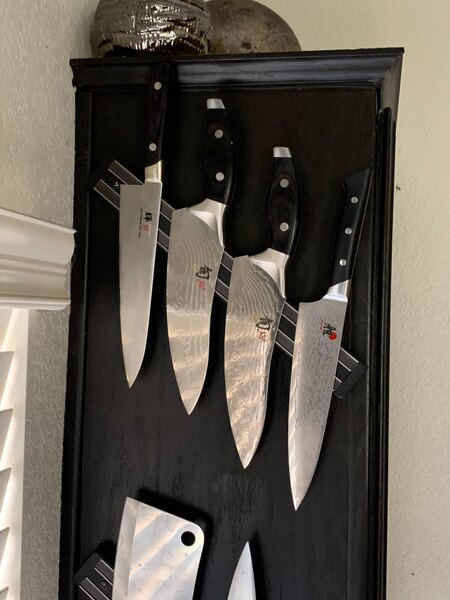 The 24 inch Tablecraft magnetic knife rack is large enough to hold many knives, as well as strong enough to hold knives very securely. it also includes hooks to hang additional items or things that are not magnetic. It is easy to install with just two phillips head screws, which are included in the package. It's well built, simple, easy to install, and has very strong magnets so that things don't fall. Great for reducing clutter on your countertop and keeping your knives within easy reach.