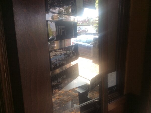 Multi lingual sign that expresses the fact that we do not allow smoking, in fact it is a law that there is no smoking in any public business in our state.