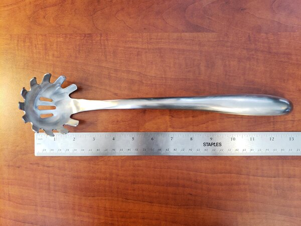 A great pasta fork! The handle is hollow which makes it so that it's not unbearably heavy to use. The notch for your hand on the handle is a nice touch.